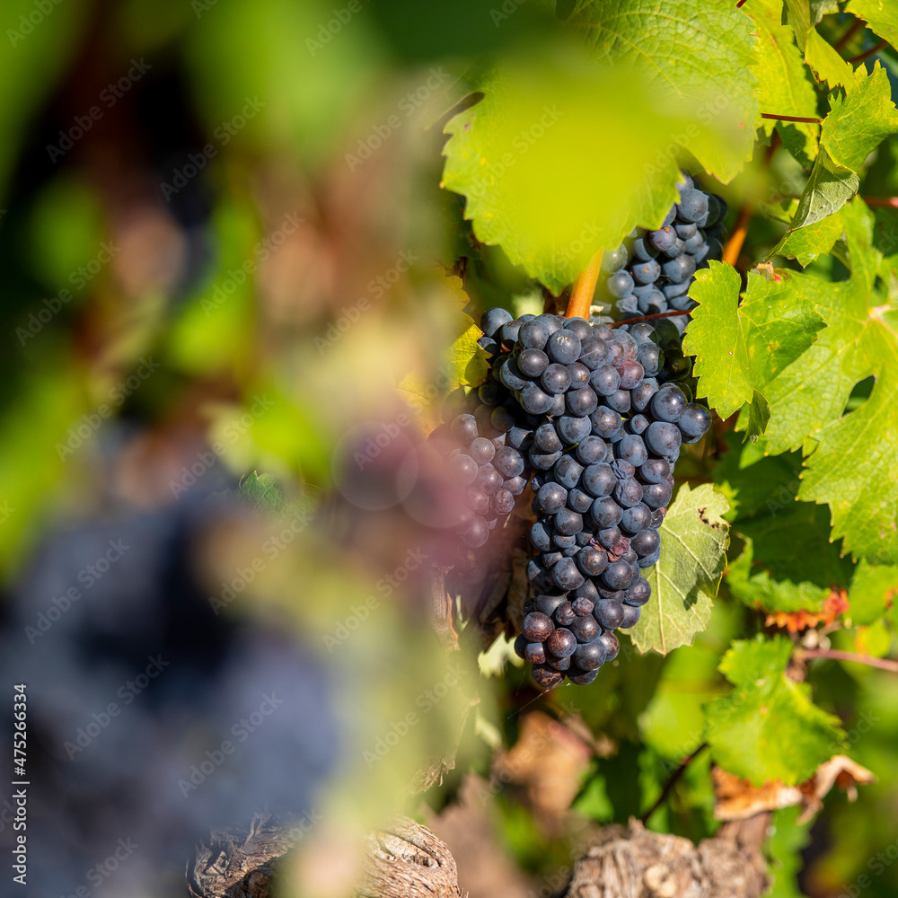 Grappe de raisin noir dans les vigne pour la vinification du vin rouge.