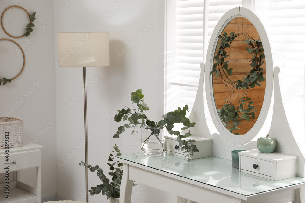 Stylish dressing table decorated with beautiful eucalyptus branches indoors