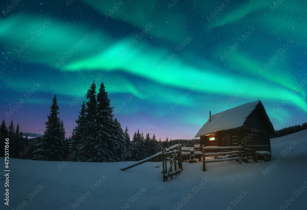 Fantastic winter landscape with wooden house with light in window in snowy mountains and northen light in night sky. Christmas holiday and winter vacations concept