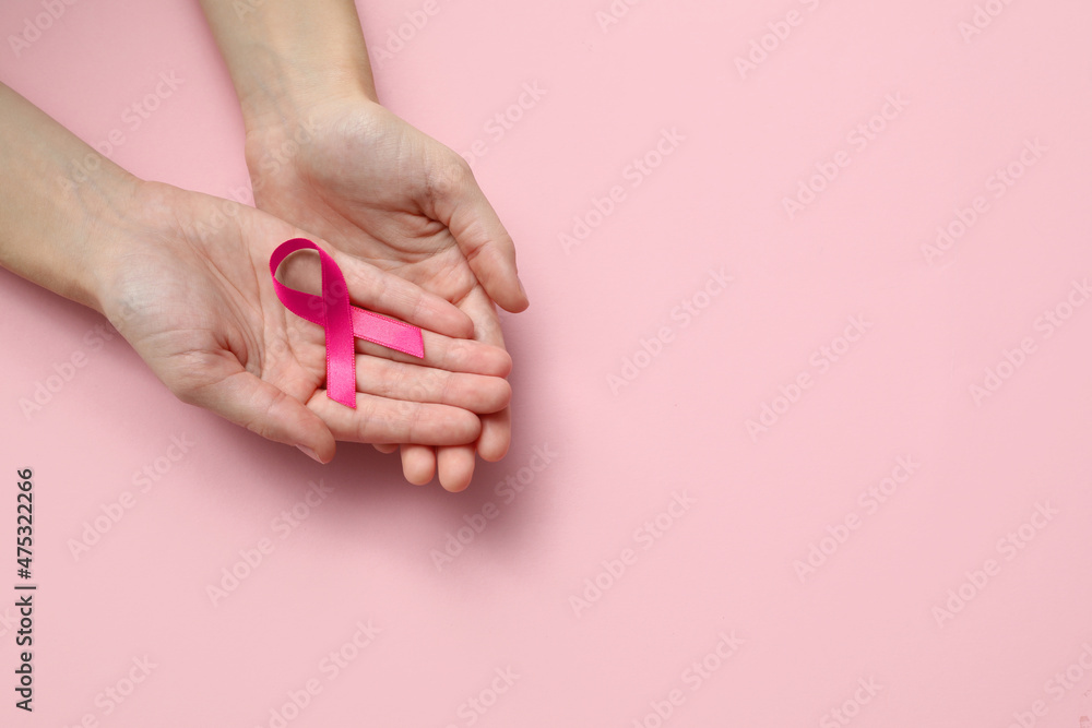 Woman holding pink ribbon on color background, top view with space for text. Breast cancer awareness concept