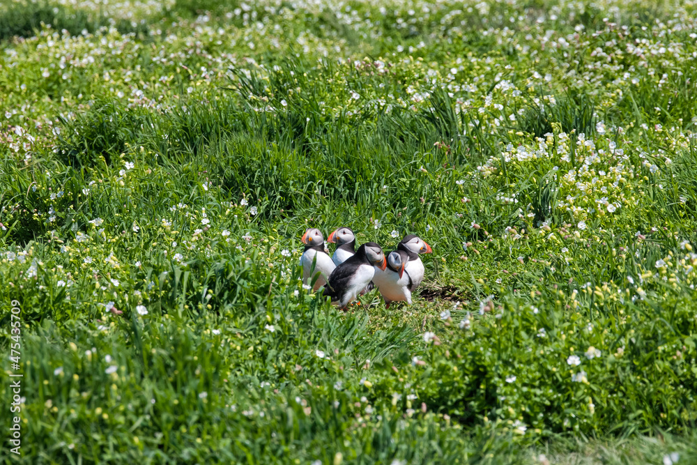 Atlantic Puffins (Fratercula arctica) on the meadow, Northumberland, UK