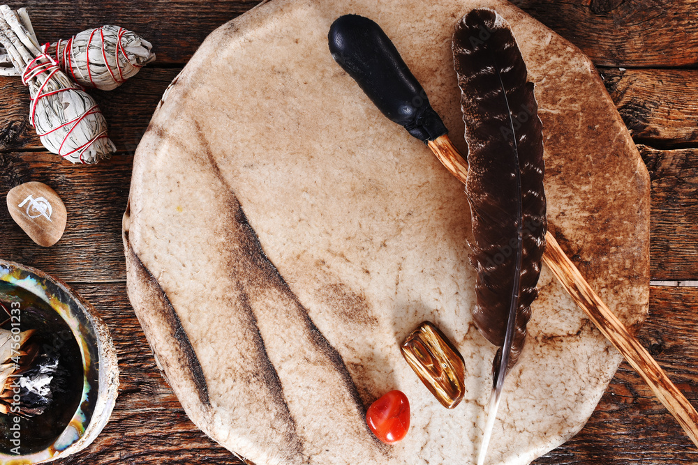 A top view image of a handmade leather meditation drum with sacred feather and sage smudge sticks.