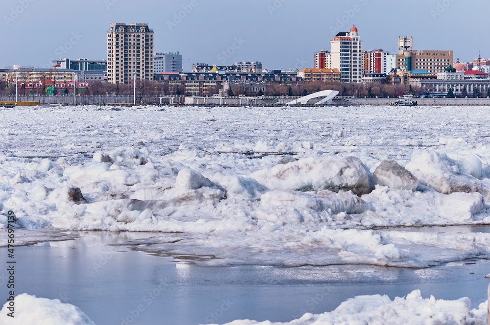 The beginning of the spring ice drift. View of the city of Heihe, China from the city of Blagoveshchensk, Russia. Blurred ice of the Amur River and thawed patches in the foreground. Sunny day.