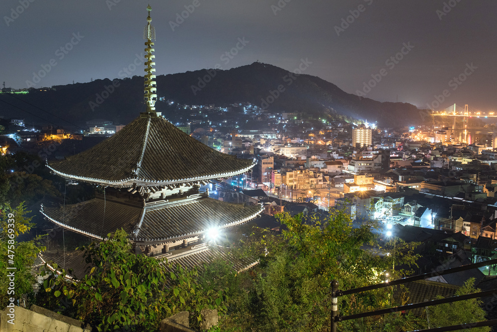 Lit up three-storied pagoda in Tenneiji Temple and Onomichi City view at night, Hiroshima, Japan ライトアップされた天寧寺の三重塔と尾道市の夜景 広島県