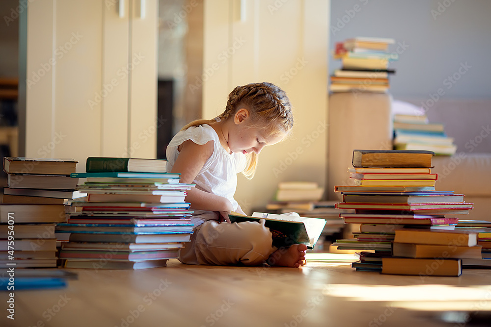 A little cute girl in a yellow dress reading a book sitting on the floor