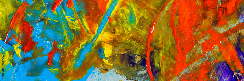 colorful creative motley background: smudged residues of oil paints on a wooden palette, short focus, selective blur