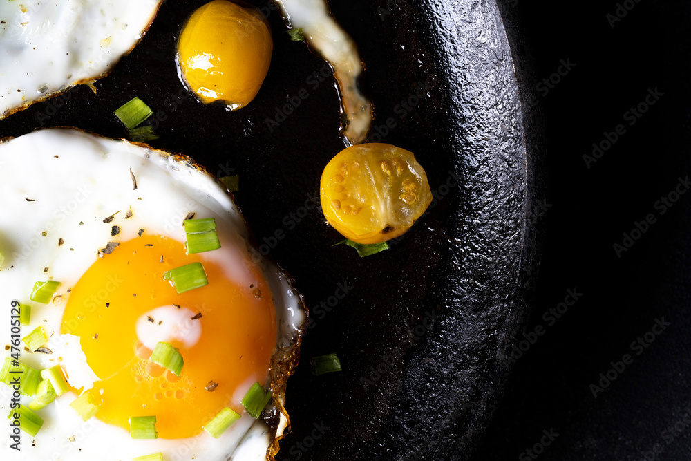 breakfast with fried eggs in a pan with bacon and vegetables on dark background
