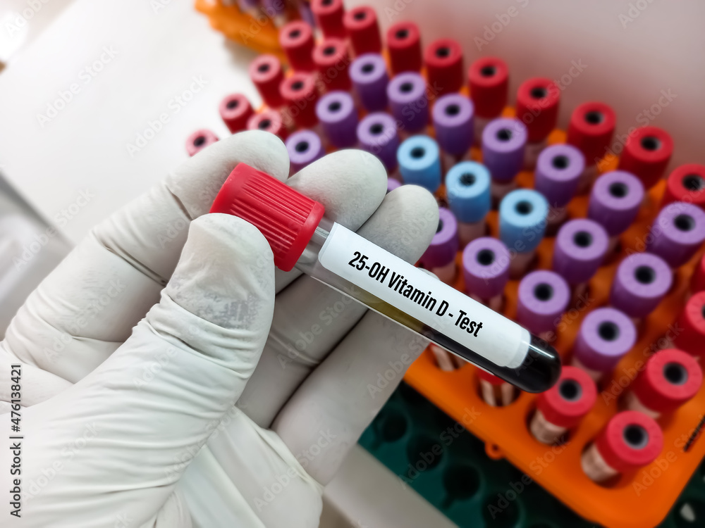 Test Tube with blood sample for 25-OH vitamin D test. A medical testing concept in the laboratory background.