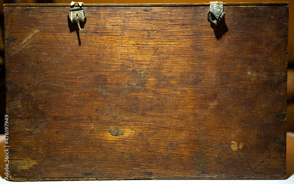 The texture of the old wood is brown. An old wooden box, a place for text.Antique wooden box.