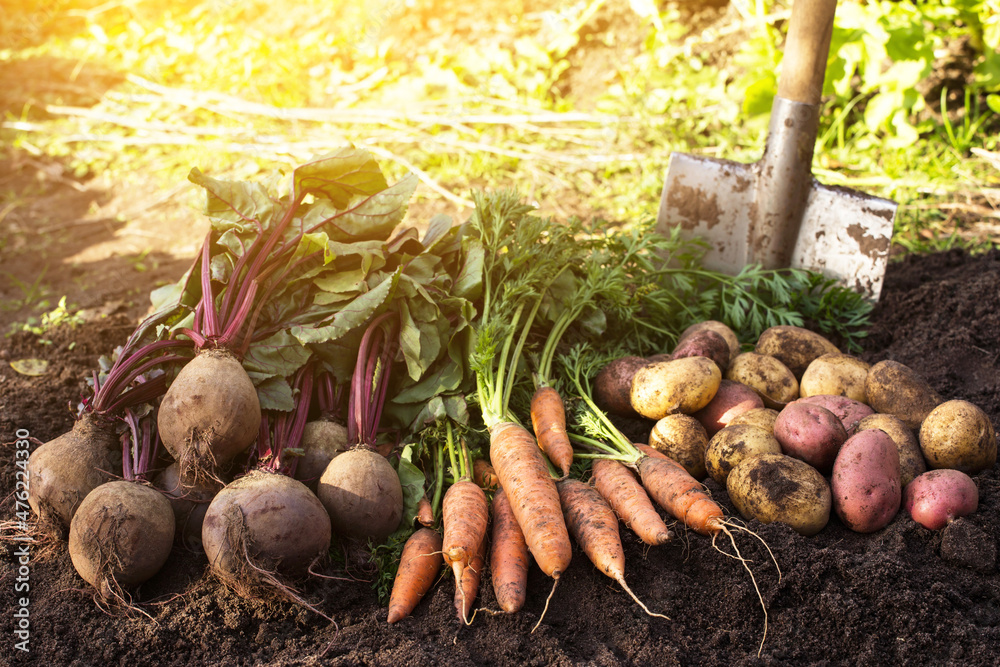 Organic carrot, beetroot, and potatoes in sunlight. Autumn harvest of different fresh raw vegetables on soil in garden