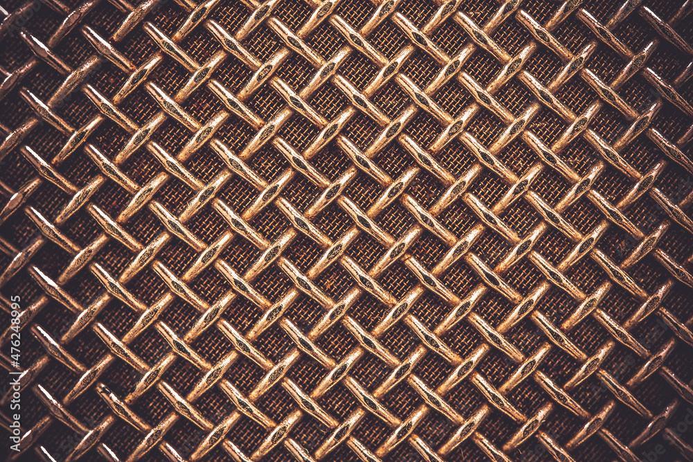 Knitted wire background pattern combined in two layers. Vintage background photo of metal mesh wires on microphone.