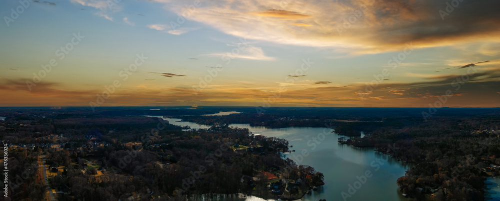 a stunning aerial panoramic shot of the silky green Catawba River surrounded by vast miles of green and autumn colored trees with blue sky and powerful clouds at sunset in Charlotte North Carolina