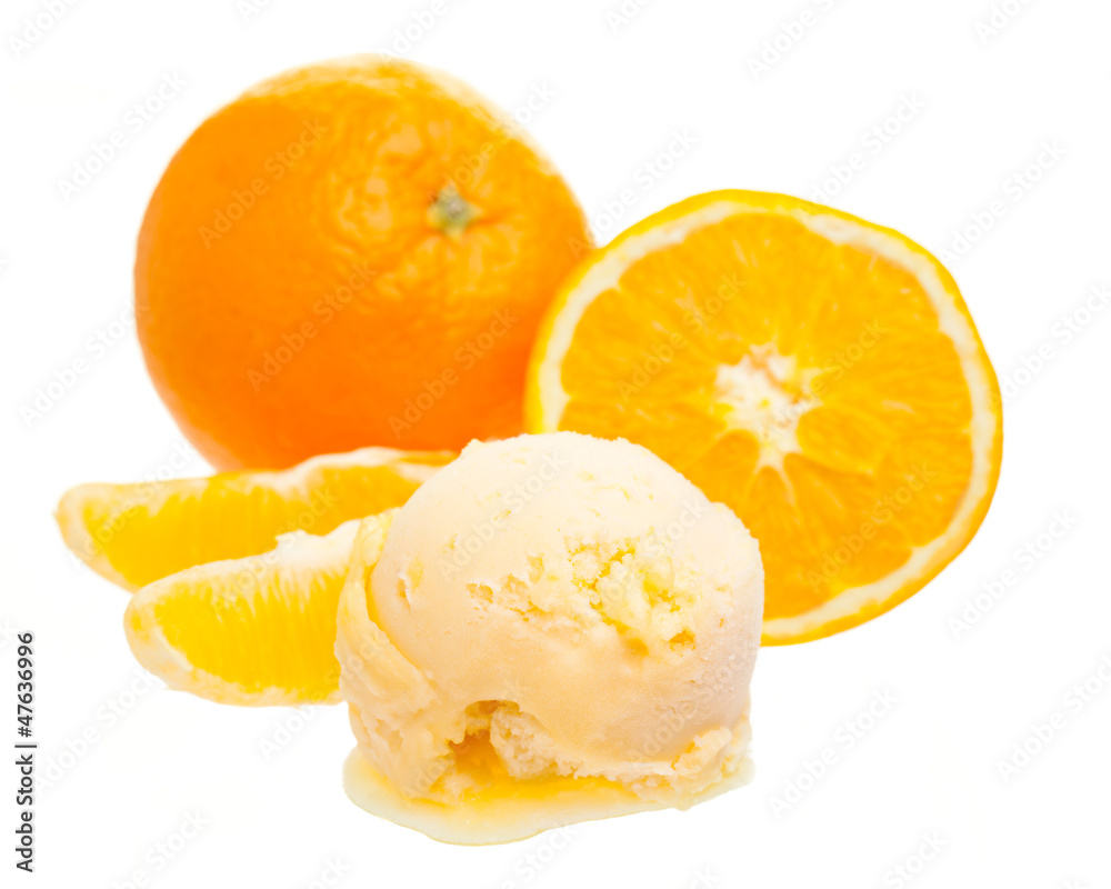 Eine Kugel Orangeneis vor Orange und Orangenspalten