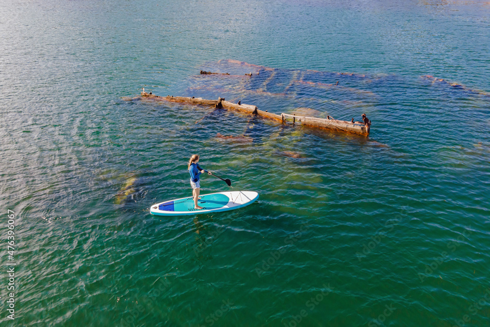 Woman on paddle board, sup next to Abandoned broken shipwreck sticking out of the sea