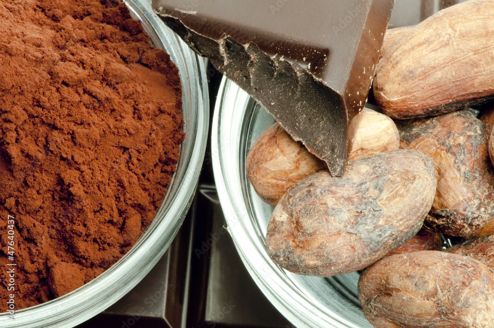 Cocoa beans, cocoa powder in bowls and chocolate bar