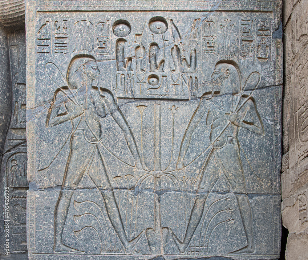 Hieroglyphic carvings on an ancient egyptian temple wall