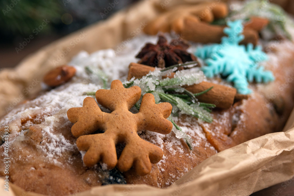 Snowflake gingerbread close up. Christmas stollen is a traditional Christmas holiday German baked goods. Holidays Christmas and New Year.