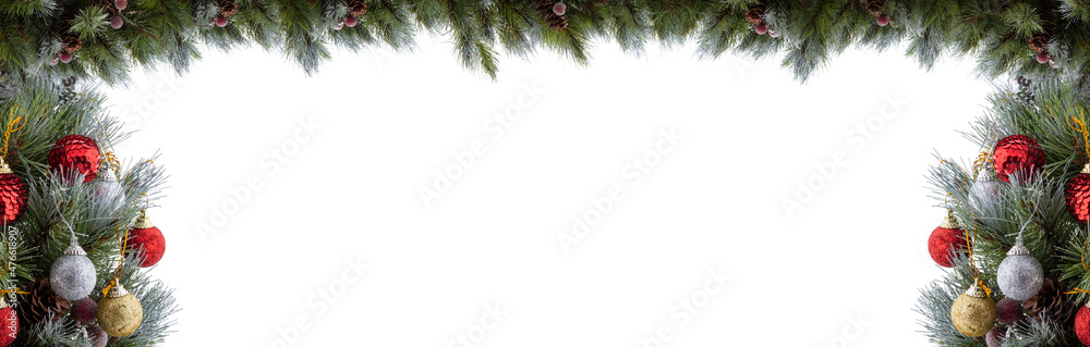 Christmas green pine branches with red, golden, silver balls, cones, red berries. Tips of pine twigs covered with snow. Pine twigs on top frame copy space. Isolated on white background. Banner size