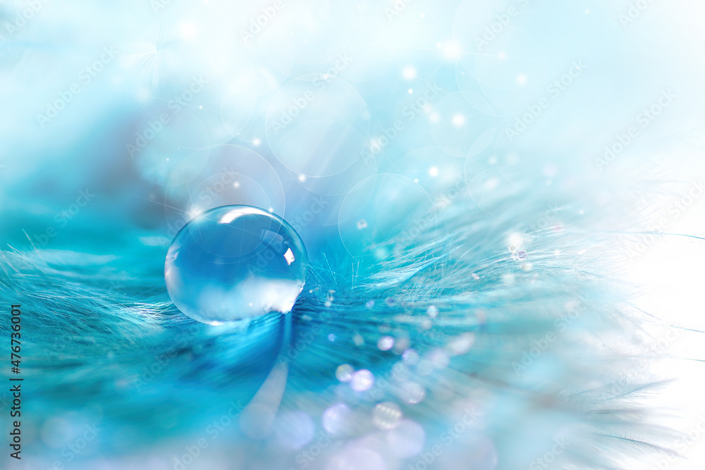 Beautiful drop of water on fluffy feather with sparkling bokeh on light blue blurred background, macro . Abstract romantic delicate magical artistic image purity and fragility of nature.