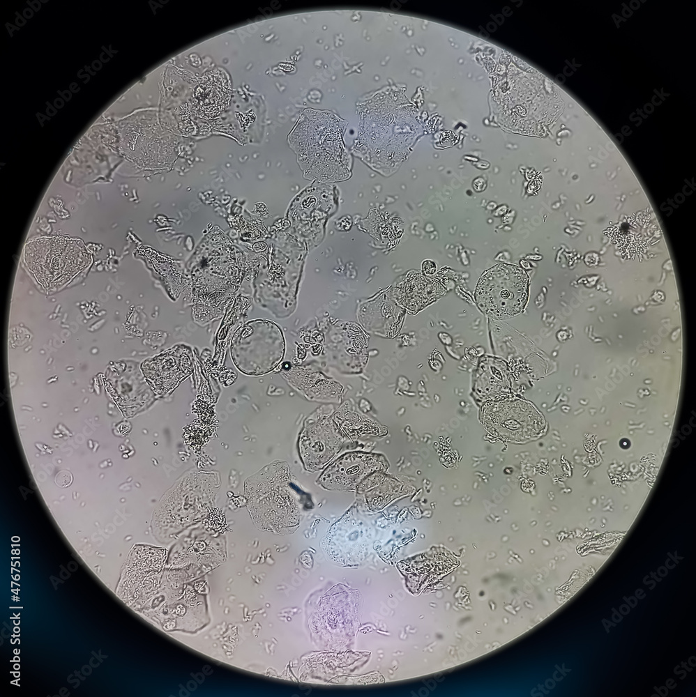 Epithelial cells with bacteria in patient urine (urinary tract infections), analyze by microscope, contrast adjustment