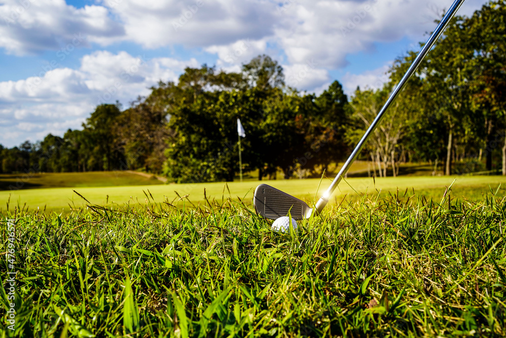 Golf clubs and golf balls on a green lawn in a beautiful golf course with morning sunshine. golf ball on green grass ready to hit on golf course background
