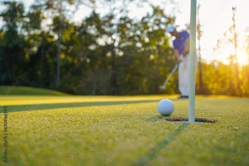 Golfer action to win after long putting golf ball on the green golf, lens flare on sun set evening time.