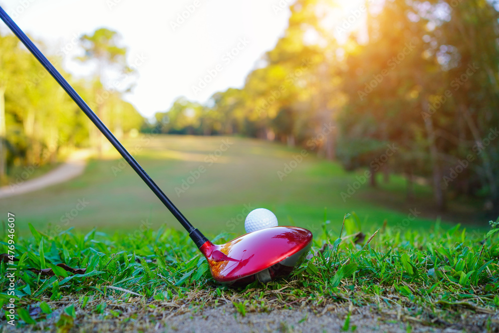 Golf clubs and golf balls on a green lawn in a beautiful golf course with morning sunshine. golf ball on green grass ready to hit on golf course background