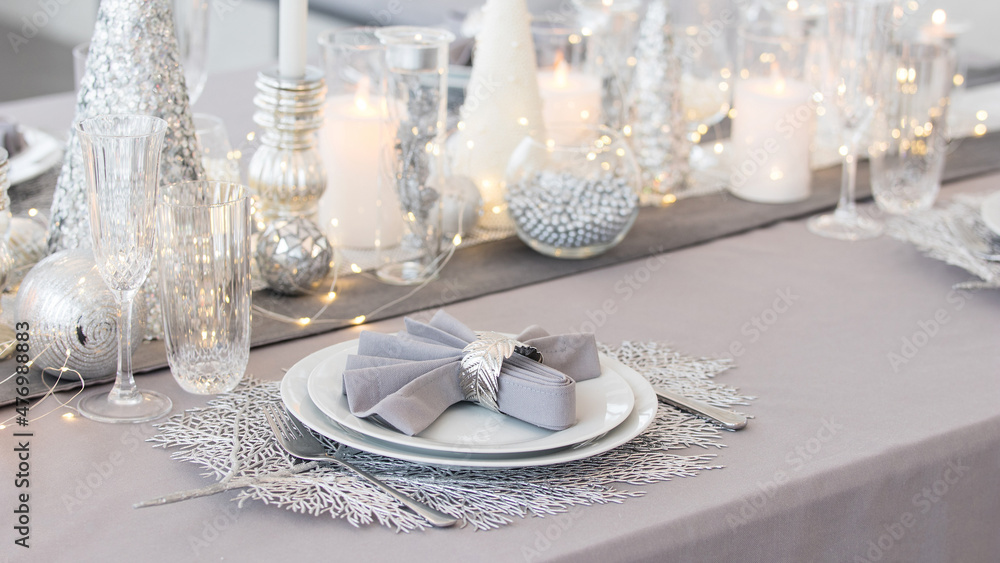 Beautiful table setting with Christmas decorations. Silver colors