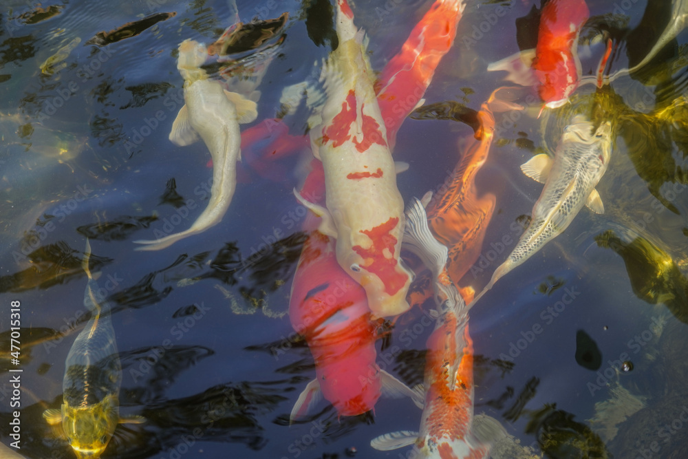 Beautiful red black white and orange colorful Koi fish in the water canal