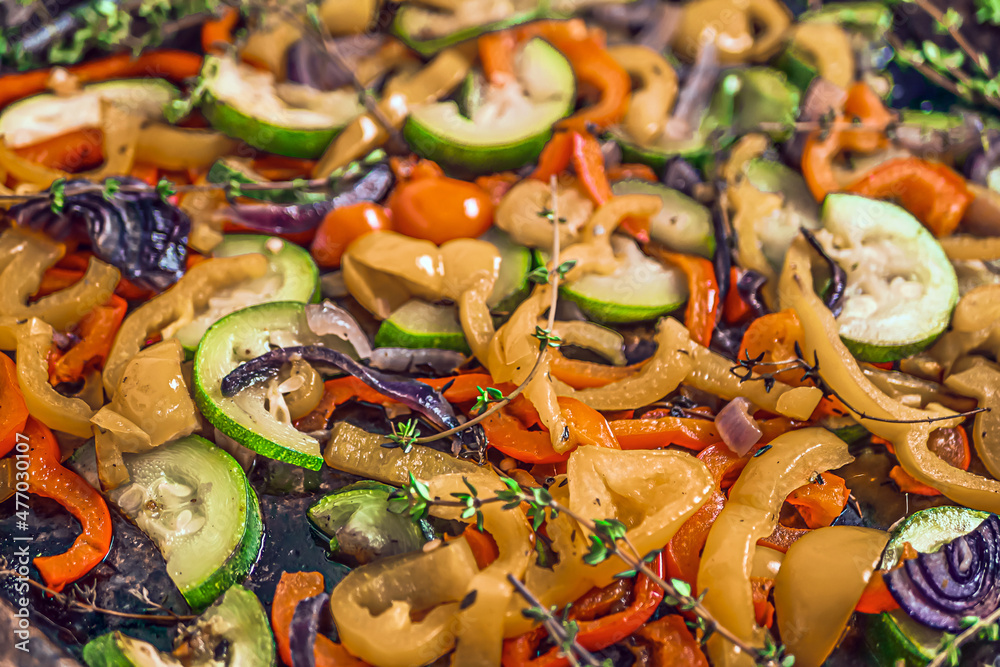 Baked Sheet Pan Vegetables Close up, Roasted Sheet Pan Vegetables