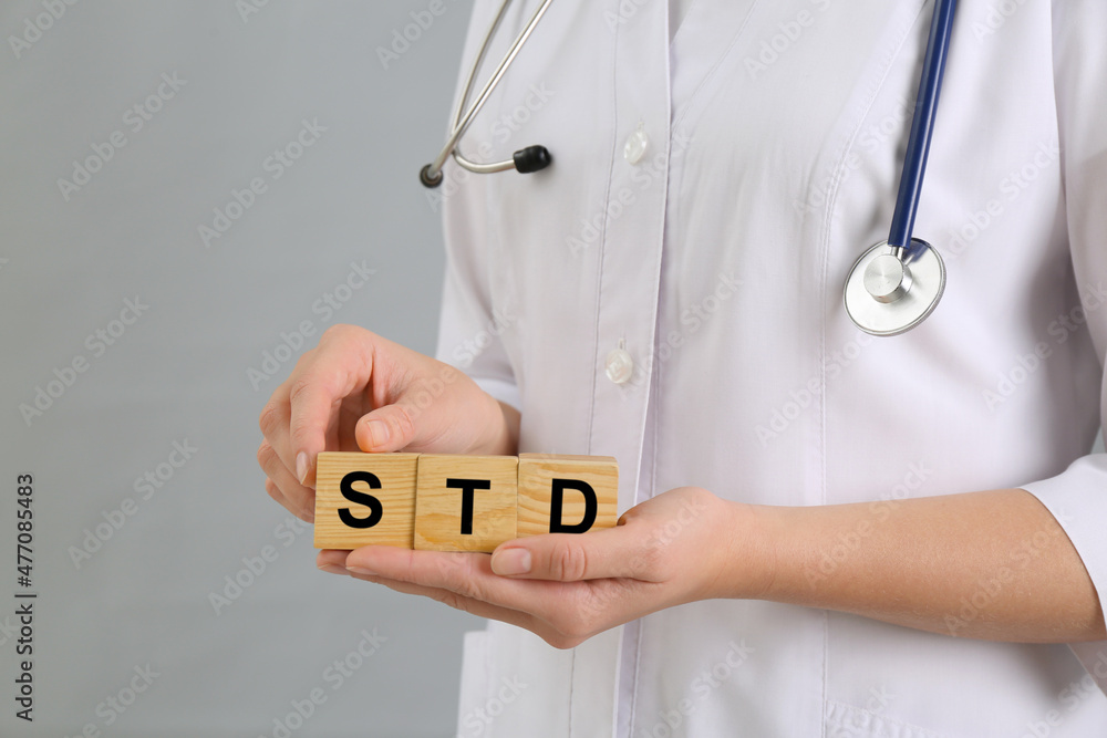 Doctor holding wooden cubes with abbreviation STD on grey background, closeup