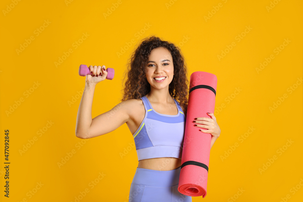 Beautiful African American woman with yoga mat and dumbbell on yellow background
