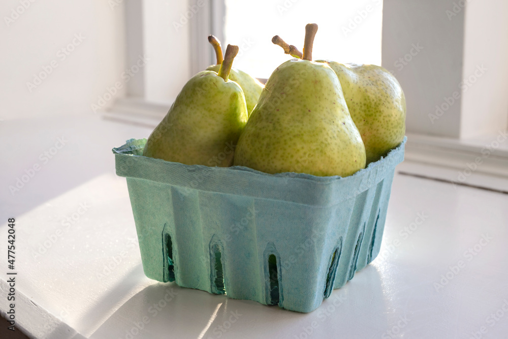 green pears in blue fruit carton