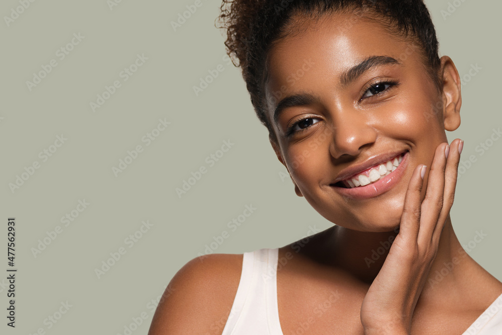 Beauty woman black skin face smiling model touching her face. Color background. Green
