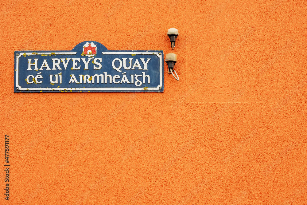 Sign Harvey's quay in English and Irish language on a saturated orange wall. Limerick town, Ireland.