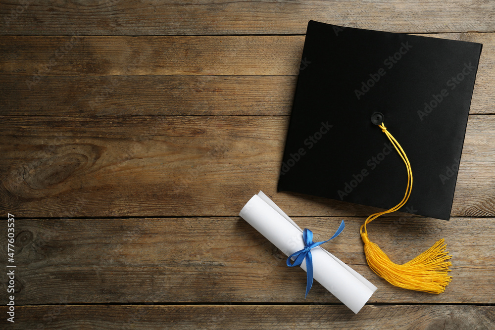 Graduation hat and diploma on wooden table, flat lay. Space for text