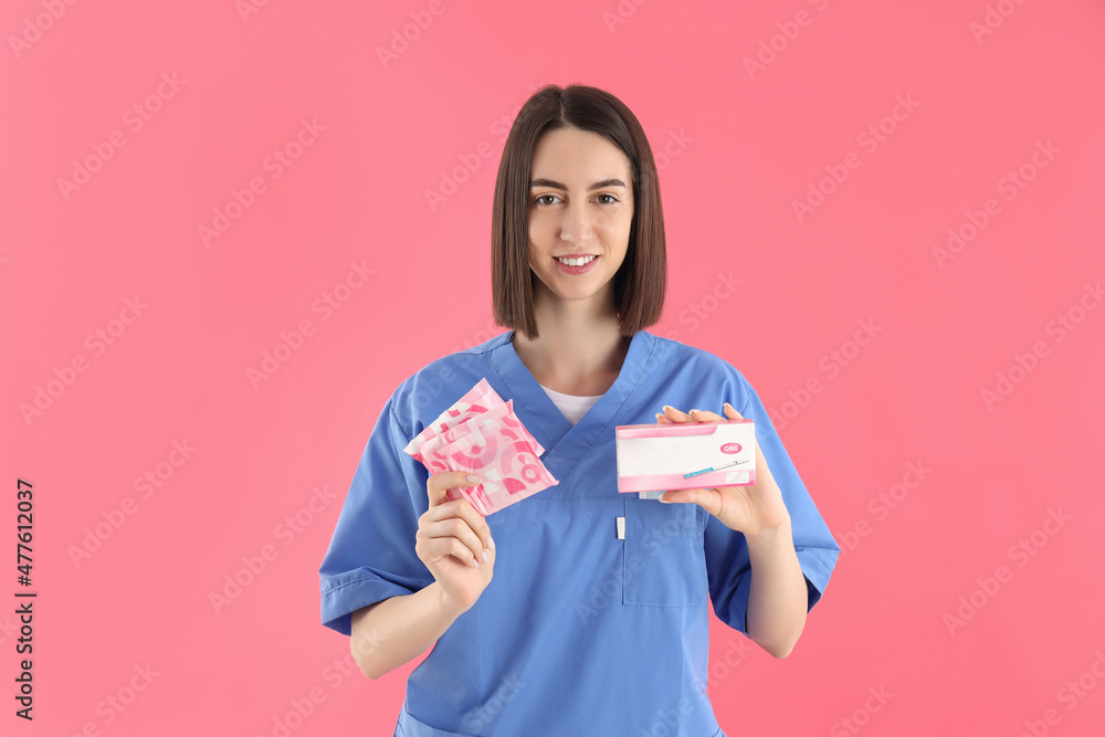 Female nurse with pads and pregnancy test on pink background