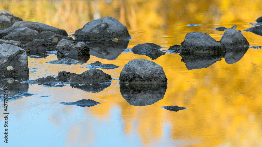 Stepping stones in clear still pond water and yellow colorful reflection landscape background