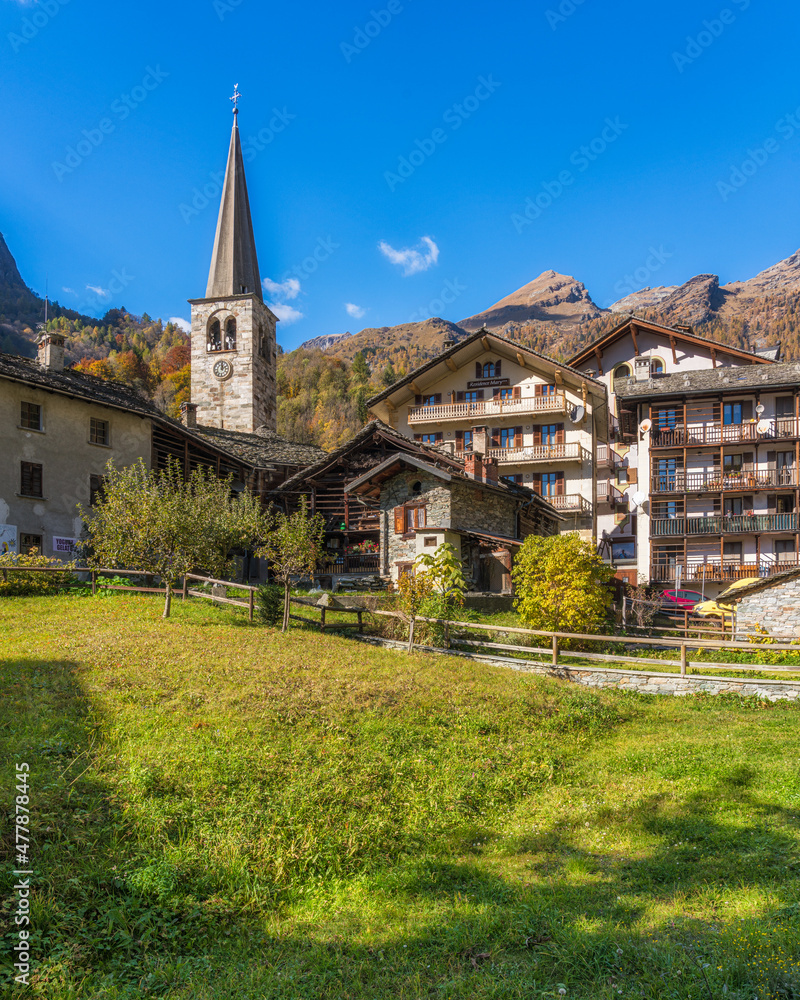 The beautiful village of Alagna Valsesia, during fall season, in Valsesia (Sesia Valley). Province of Vercelli, Piedmont, Italy.