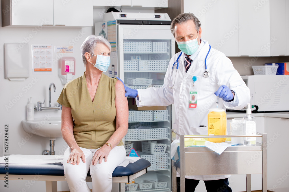 A White Male Medical Doctor Disposes of Syringe Needle Safely in Sharps Collector after a Covid-19 Vaccine Injection Wearing Generic ID Badge, Lab Coat, Gloves and Mask in Hospital or Health Clinic.
