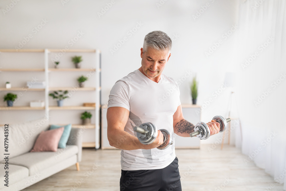 Athletic mature man doing dumbbell workout at home, working on arms strength, looking at his biceps, free space