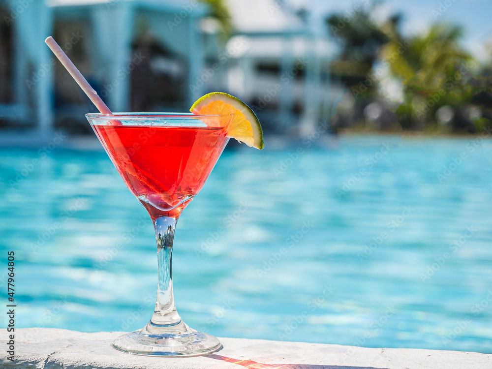 Beautiful glass with a refresh cocktail and a pretty woman on the background of the swim pool. Top view, close-up. Vacation and travel concept. Moments of celebration