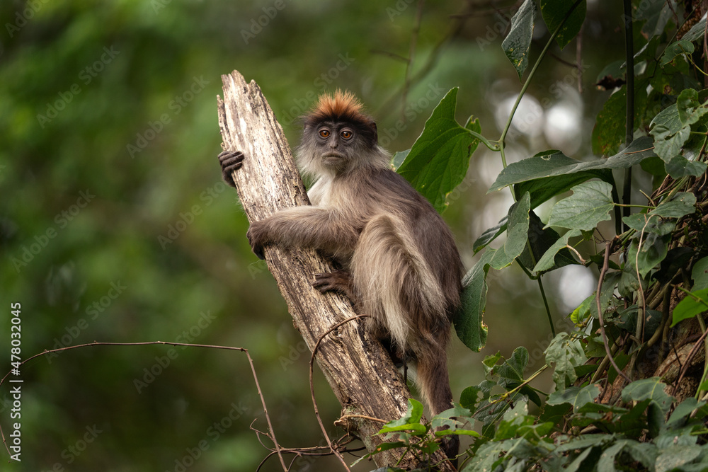 Ugandan red colobus on the branch. Monkey in Uganda. African safari.