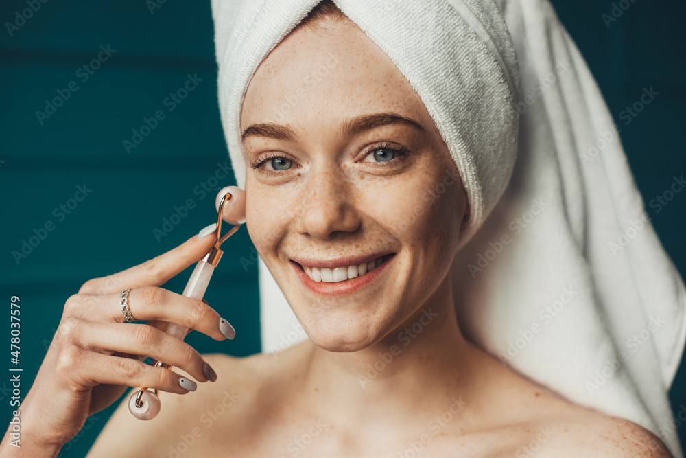 Close-up portrait of a woman getting massage face using jade facial roller for skin care. Facial treatment.