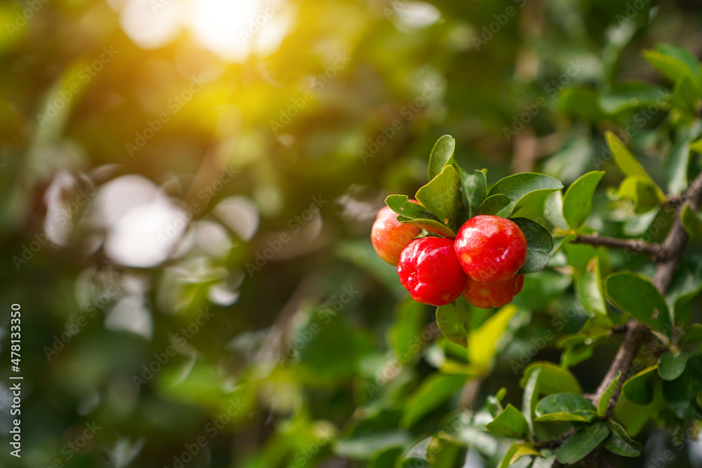 Fresh organic Acerola cherry on the tree.