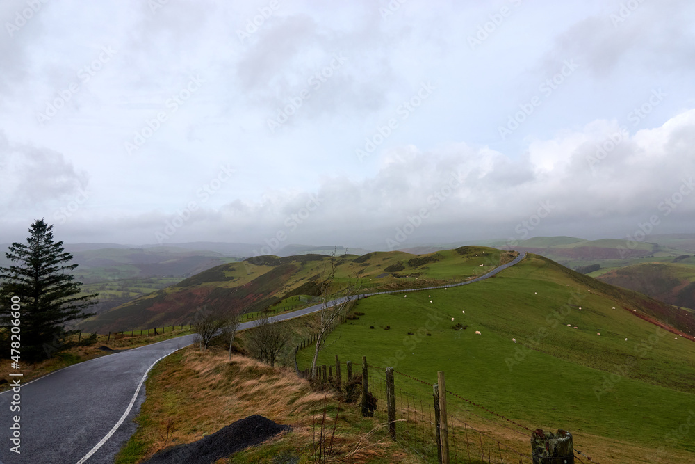 Beautiful day in Welsh mountains with a twisty road. United Kingdom, Wales in late winter.