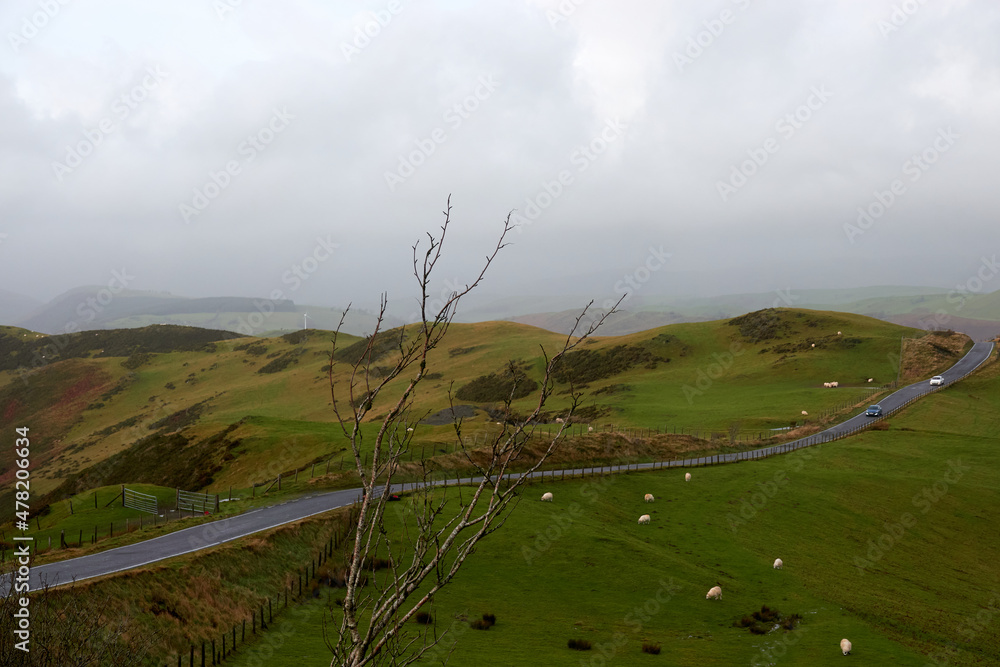 Beautiful day in Welsh mountains with a twisty road. United Kingdom, Wales in late winter.