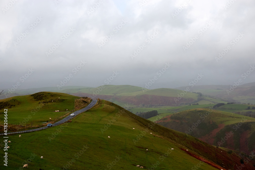 Beautiful day in Welsh mountains with a twisty road. United Kingdom, Wales in late winter.