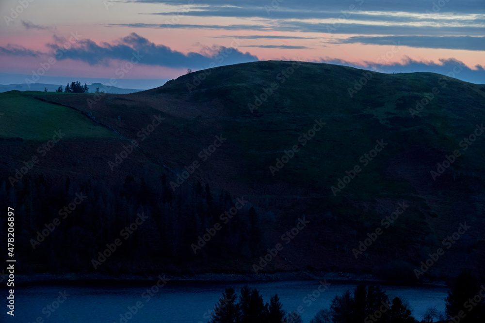Lake in the evening. Sunset. Clouds. United Kingdom, Wales in late winter.