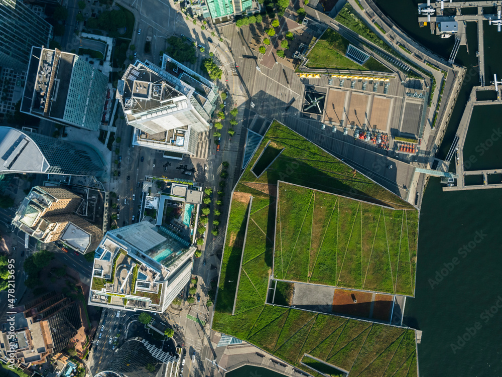 Stock Aerial Photo of Vancouver Convention Center and Olympic Cauldron Vancouver BC , Canada